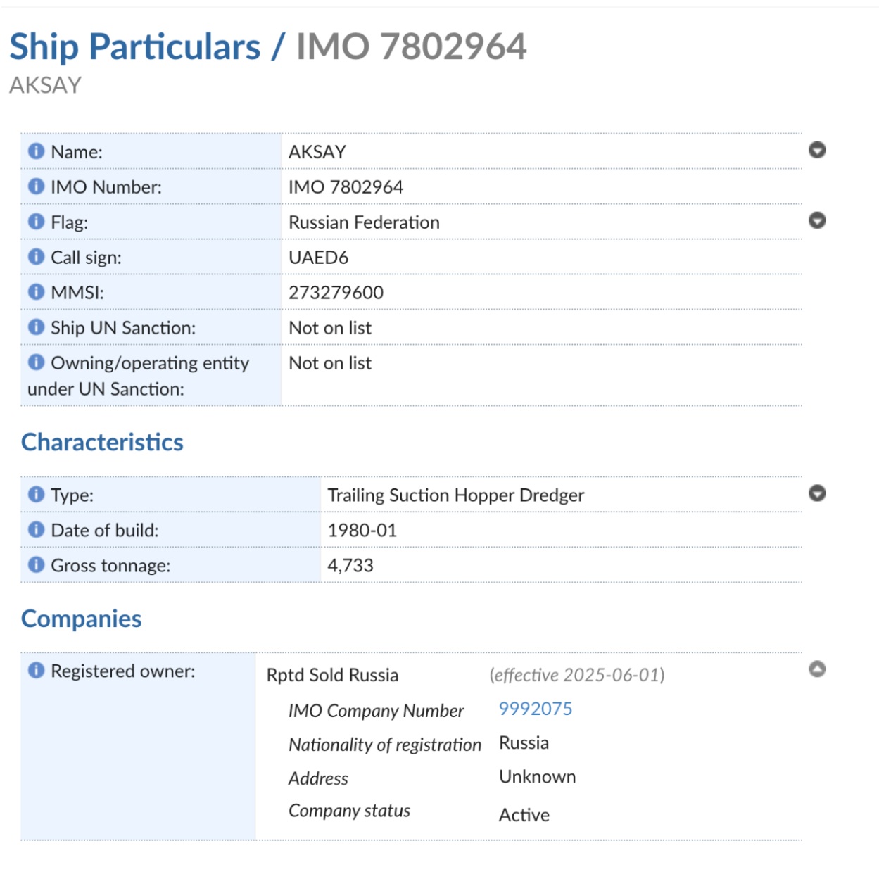 У червні цього року судно Aksay було продане в Росії, причому новий власник вирішив не розкривати свої дані, тому в базі IMO в рядку реєстраційний власник — напис Rptd sold Russia. Така практика нерозкриття судновласників існує давно, а Росія активно її використовує зараз для формування так званого «тіньового флоту».