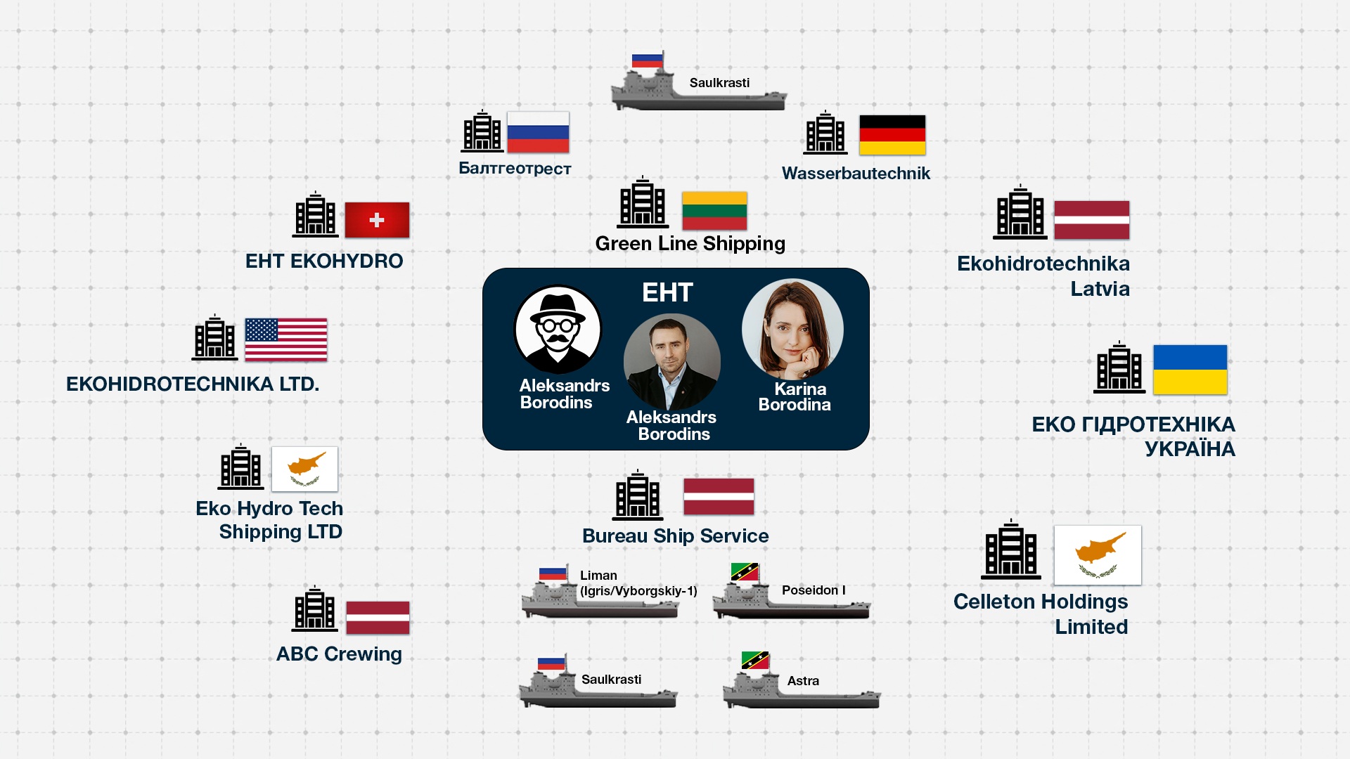 Бенефіціарним засновником латвійської компанії Ekohidrotechnika Latvia з моменту її реєстрації у 2014 році, одноосібно є Александрс Бородінс-молодший, а Каріна Бородіна  — її директор. За видом діяльності ця компанія — агент з торгівлі машинами, обладнанням, морськими і повітряними суднами. А на окремому від групи сайті є і пропозиції послуги із управління екіпажами, виставлення рахунків та технічного обслуговування.
