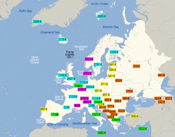 В менее развитых экономиках реальные доходы населения могут превышать официальные ввиду существенной доли серой экономики. Сиреневым цветом указаны зарплаты, превышающие €3 тыс, синим — в диапазоне €2-3тыс, зеленым — в диапазоне €1-2 тыс, желтым — в диапазоне €0,5-1 тыс, оранжевым — менее 500 евро.