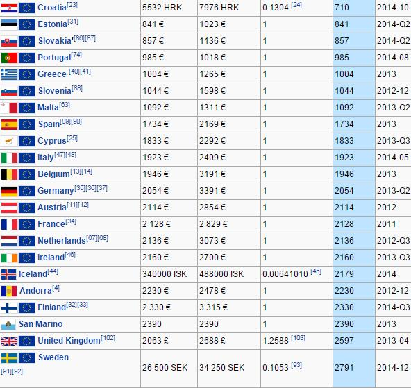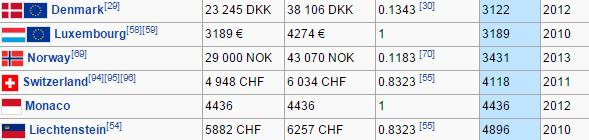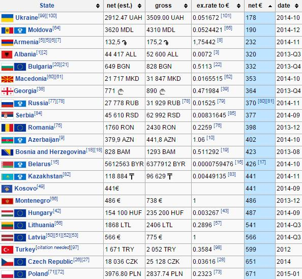 Википедия составила карту и список стран, в котором в местных валютах, евро и долларах США указаны средние месячные зарплаты «брутто» и «нетто» (после уплаты налогов). На карте изображены средние зарплаты «нетто» на основании различных источников.