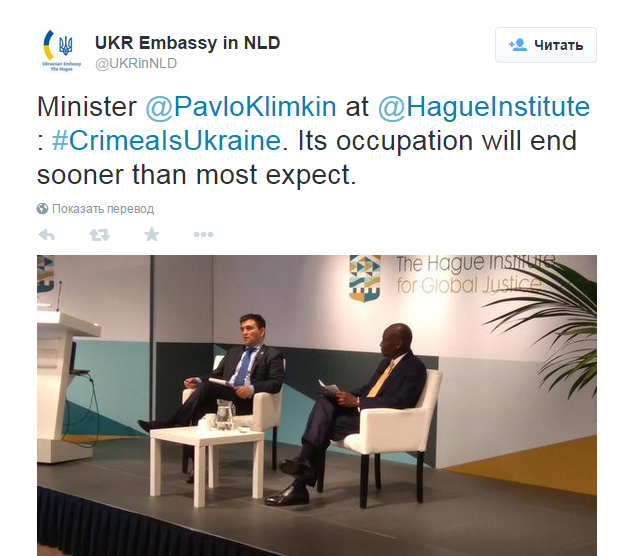 Оккупация Крыма закончится раньше, чем этого можно ожидать. Об этом во время выступления в Гаагском институте глобального правосудия заявил министр иностранных дел Украины Павел Климкин.