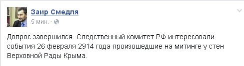 «Следственный комитет РФ интересовали события 26 февраля 2914 года произошедшие на митинге у стен Верховной Рады Крыма», — написал он.