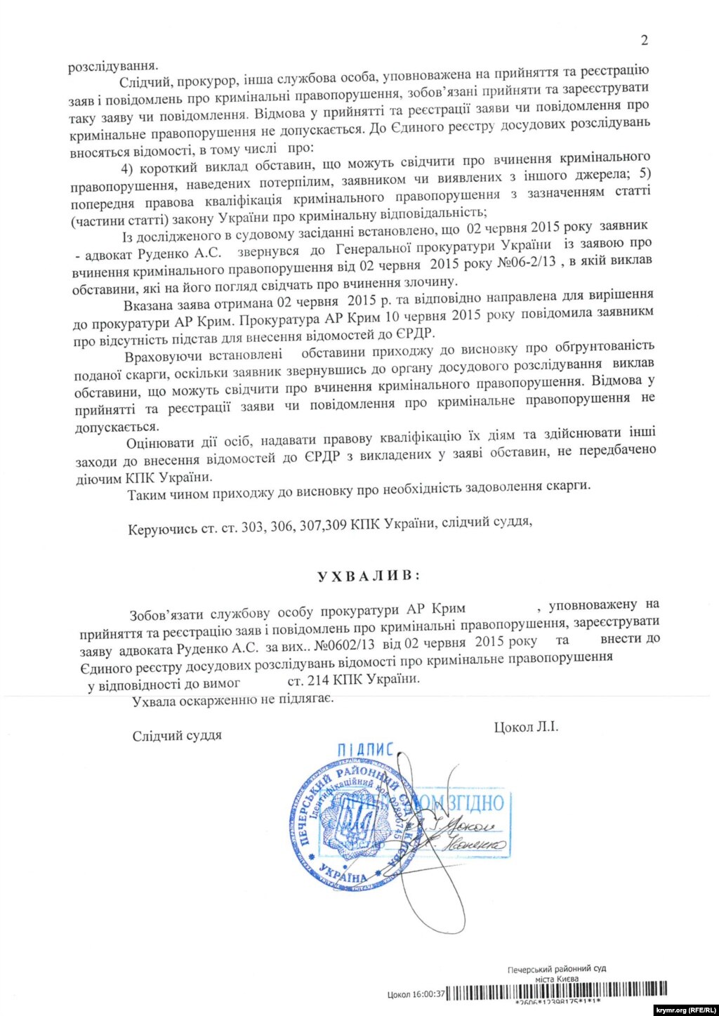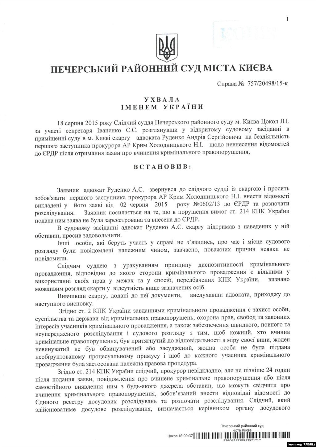 Судья Цокол обязала прокуратуру АРК внести в Единый реестр досудебных расследований (ЕРДР) заявление о незаконном лишении свободы Василия Ганыша. Соответствующее постановление обнародовало издание Крым.реалии
