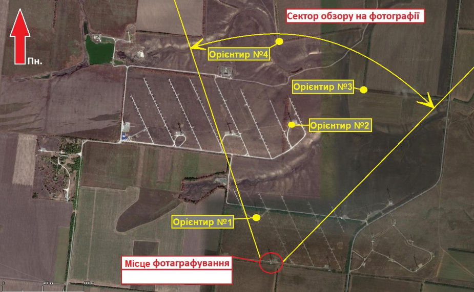 Фотография сделана 13.06.2018 года на территории Новоазовского ветроэлектростанции на одном из ветрогенераторов, подтверждением этого являются ориентиры: №1 — ветрогенератор; №2 — ветрогенератор; №3 — изгиб полезащитной лесополосы; №4 — изгиб полезащитной лесополосы.