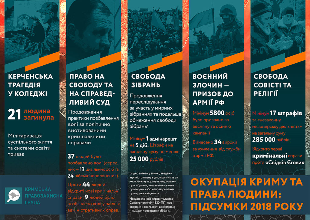 Также правозащитники отметили продолжение практики преследования крымчан за участие в мирных собраниях и дальнейшее ограничение свободы собраний на полуострове — минимум 1 админарест на 5 суток за участие в мирном собрании и штрафы не общую сумму не менее 25 000 рублей за участие в мирных собраниях.