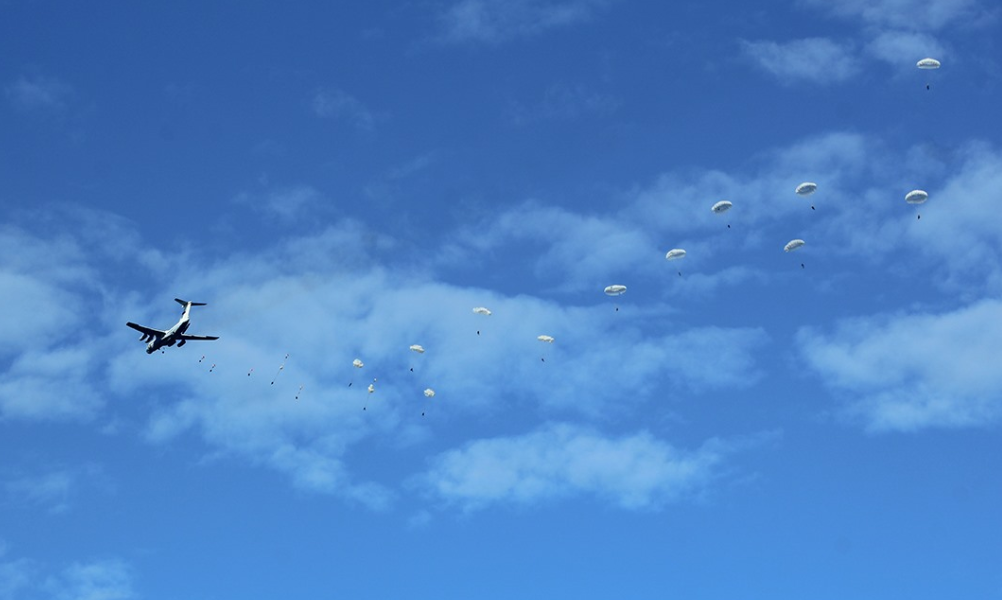 Высадка десанта проводилась с высоты 600 метров из самолетов Ил-76 двумя параллельными потоками. По сценарию учений, личный состав после десантирования совершил захват объектов условного противника и уничтожил незаконное вооруженное формирование.