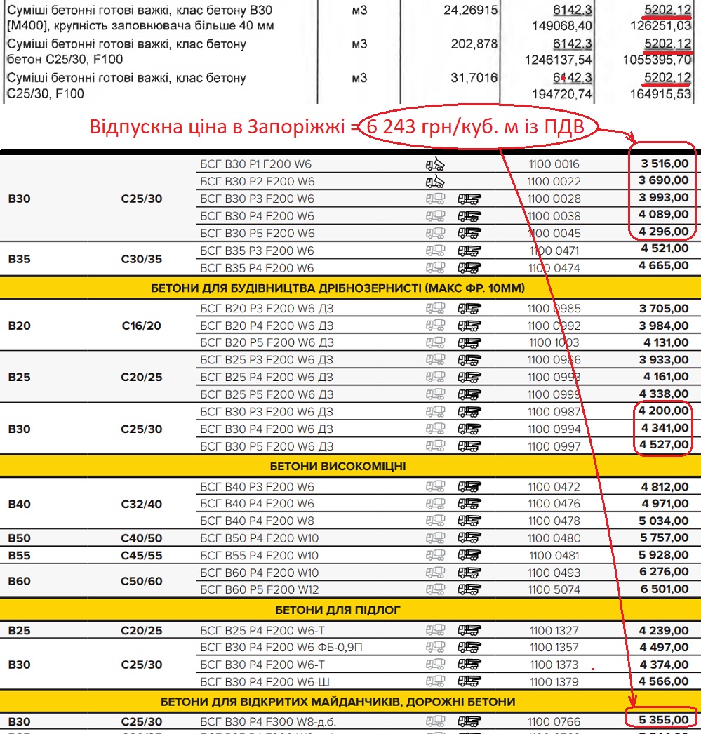 Однако ряд позиций бетонов выше рынка. К примеру, бетон В30 С25/30 F100 вписали по 6 243 грн/куб. м. Киевская группа «Кузнечная» предлагает бетоны В30 С25/30 W6 с более высокой морозостойкостью F200 по 3 516-4 296 грн/куб. м в зависимости от пластичности, а лучшую разновидность В30 С25/30 F300 W8 для открытых площадок дорог – по 5 355 грн/куб. м.